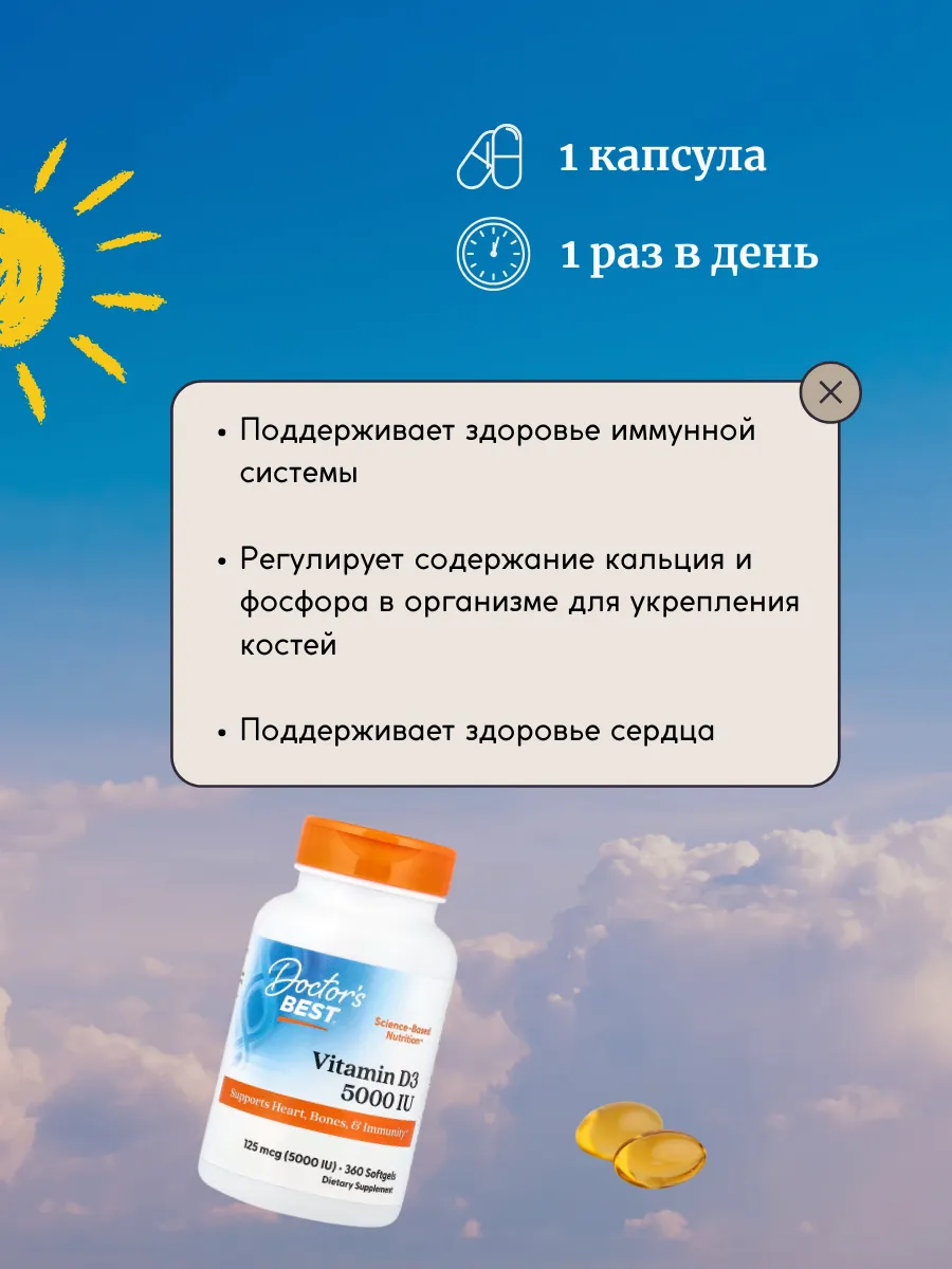 125 мкг (5000 МЕ) витамина D3 для поддержки иммунитета