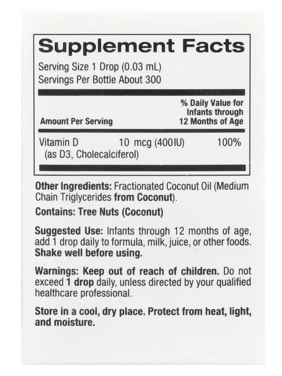 Перед использованием хорошо встряхнуть. Для младенцев и детей принимать по 1 капле в день во время еды или по рекомендации врача.