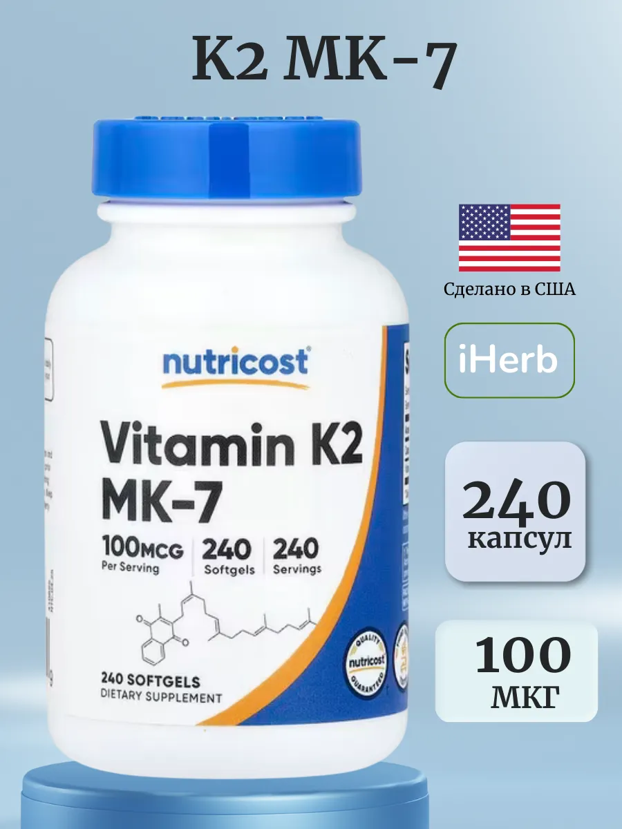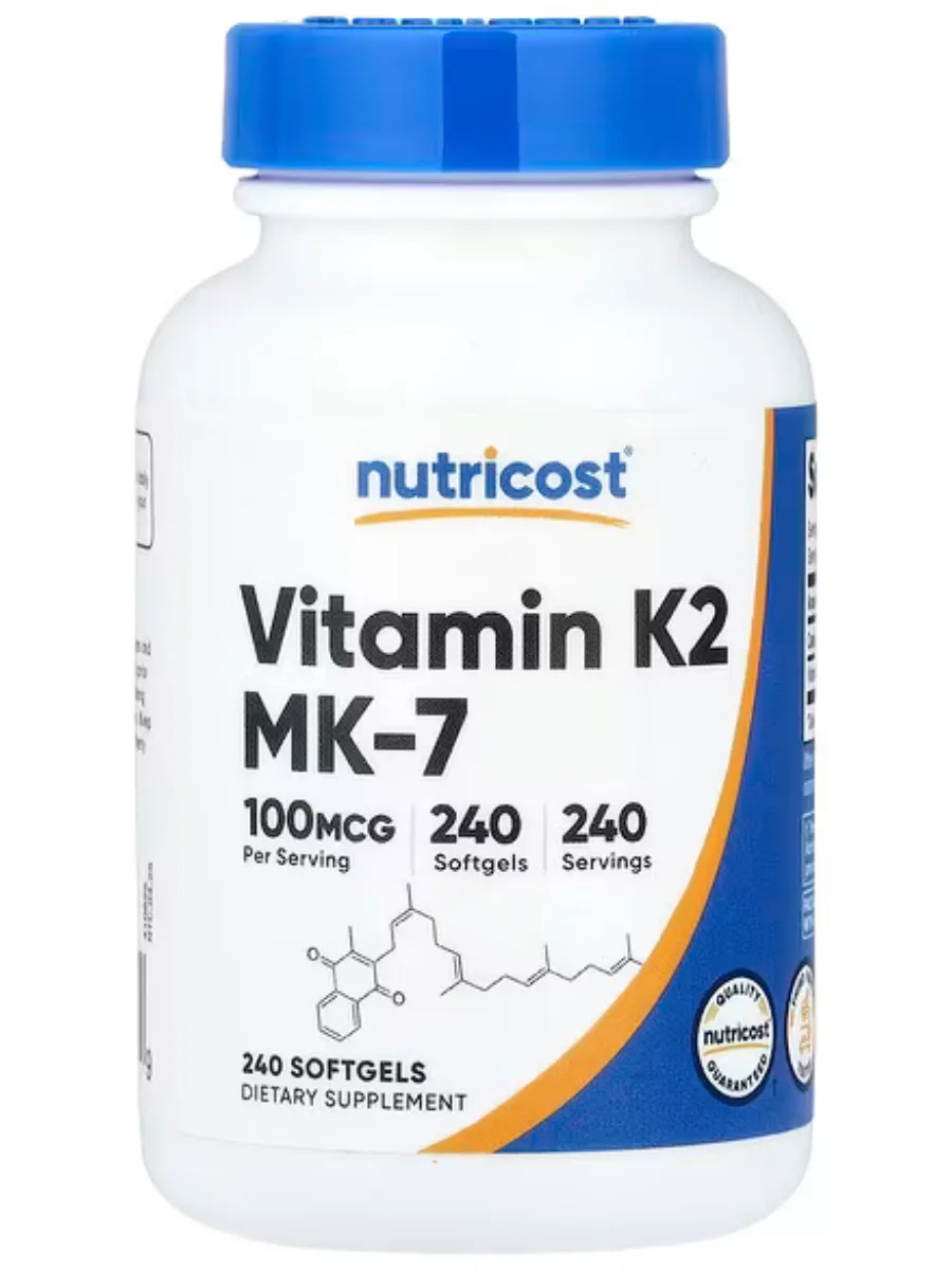 Nutricost Vitamin K2 MK-7 — это высокоусвояемая форма витамина K2 для поддержки здоровья костей и сердечно-сосудистой системы. Каждая порция (1 софтгель) содержит 100 мкг витамина K2 в форме MK-7 (менахинон-7), полученного из натурального источника (натто). Витамин K2 MK-7 помогает направлять кальций в кости и зубы, предотвращая его отложение в сосудах и артериях. Продукт растворён в масле для лучшего всасывания и подходит для ежедневного приёма. Не содержит ГМО, глютен, искусственные красители или консерванты, сертифицирован по стандартам GMP.