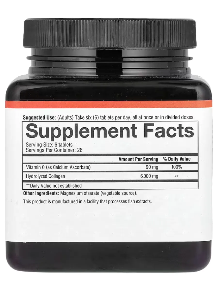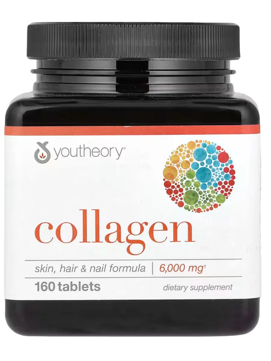 Youtheory Collagen — это коллагеновый комплекс для поддержки здоровья кожи, волос, ногтей и суставов. Каждая порция (6 таблеток) содержит 6000 мг гидролизованного коллагена (типы 1, 2 и 3) с улучшенной усвояемостью, обогащённого 90 мг витамина C для антиоксидантной защиты и формирования коллагена. Продукт разработан для борьбы с возрастным снижением коллагена и поддержания молодого вида кожи. Не содержит ГМО, глютен, молочные продукты, искусственные красители или консерванты, подходит для вегетарианцев и сертифицирован по стандартам GMP.