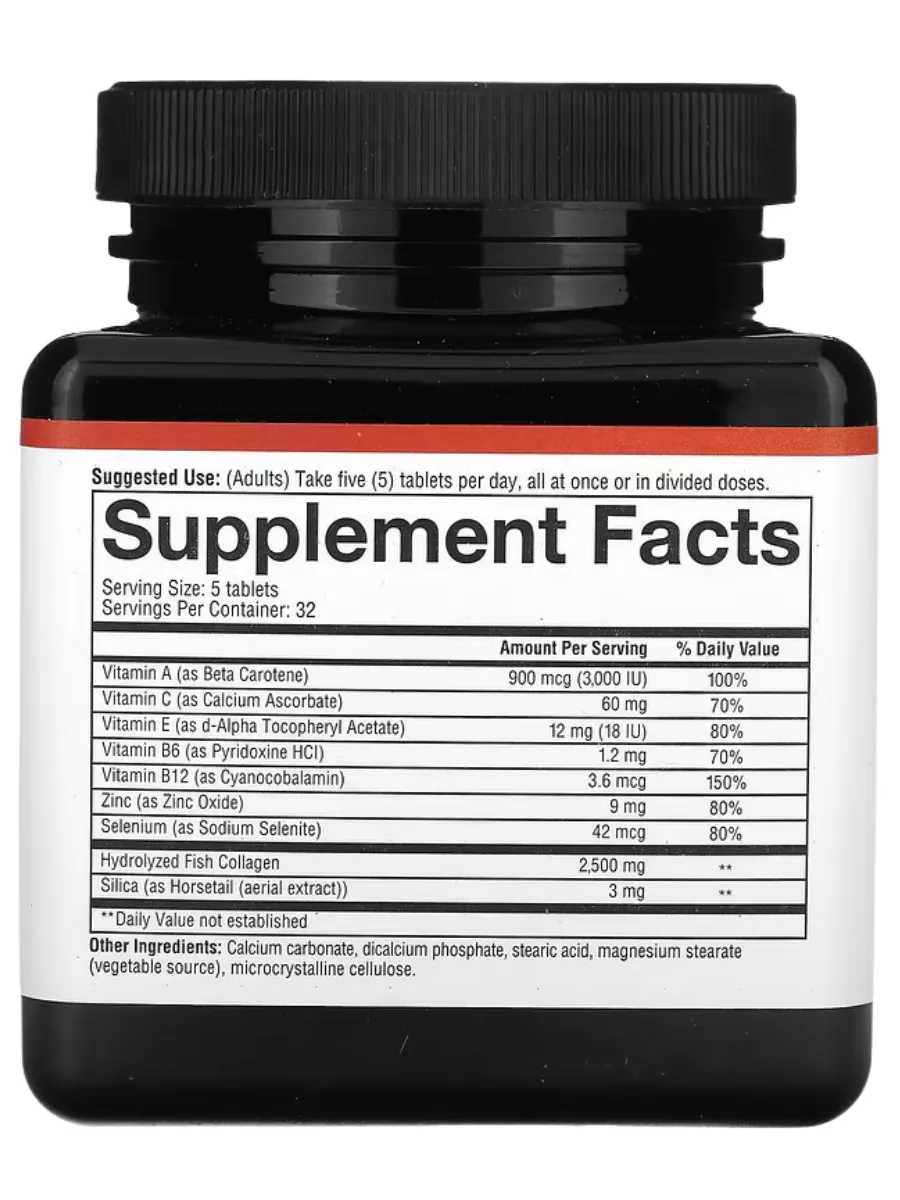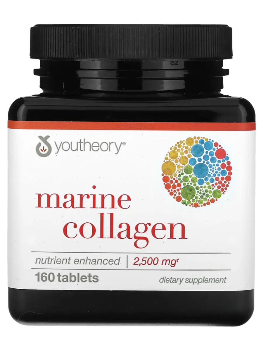 Youtheory Marine Collagen — это коллагеновый комплекс для борьбы с возрастным снижением коллагена и поддержки здоровья кожи, суставов и соединительных тканей. Каждая порция (5 таблеток) содержит 2500 мг гидролизованного морского коллагена (типы 1 и 3), полученного из рыбы, с улучшенной усвояемостью. Продукт обогащён витаминами A, C, E, B6, B12, цинком и селеном для интенсивного питания и антиоксидантной защиты. Не содержит глютен, сою, молочные продукты, искусственные красители или консерванты, сертифицирован по стандартам GMP.